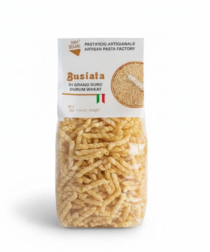 Busiata di Grano Duro jsou typické sicilské spirálové těstoviny, pocházející ze západní části ostrova. Vyráběné výhradně ze semoliny z tvrdé pšenice a vody, bez zbytečností a kompromisů.