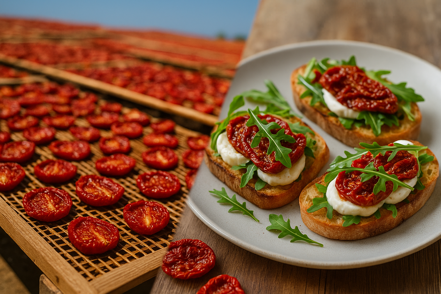 ☀️ Na Sicílii se rajčata suší po staletí tradiční metodou: rozkrojená rajčata se rozloží na dřevěné rošty a několik dní pomalu zrají pod žhavým sicilským sluncem. Díky tomu získají intenzivní chuť, plnou sladkost i jemnou slanost mořského větru, který vane z pobřeží.